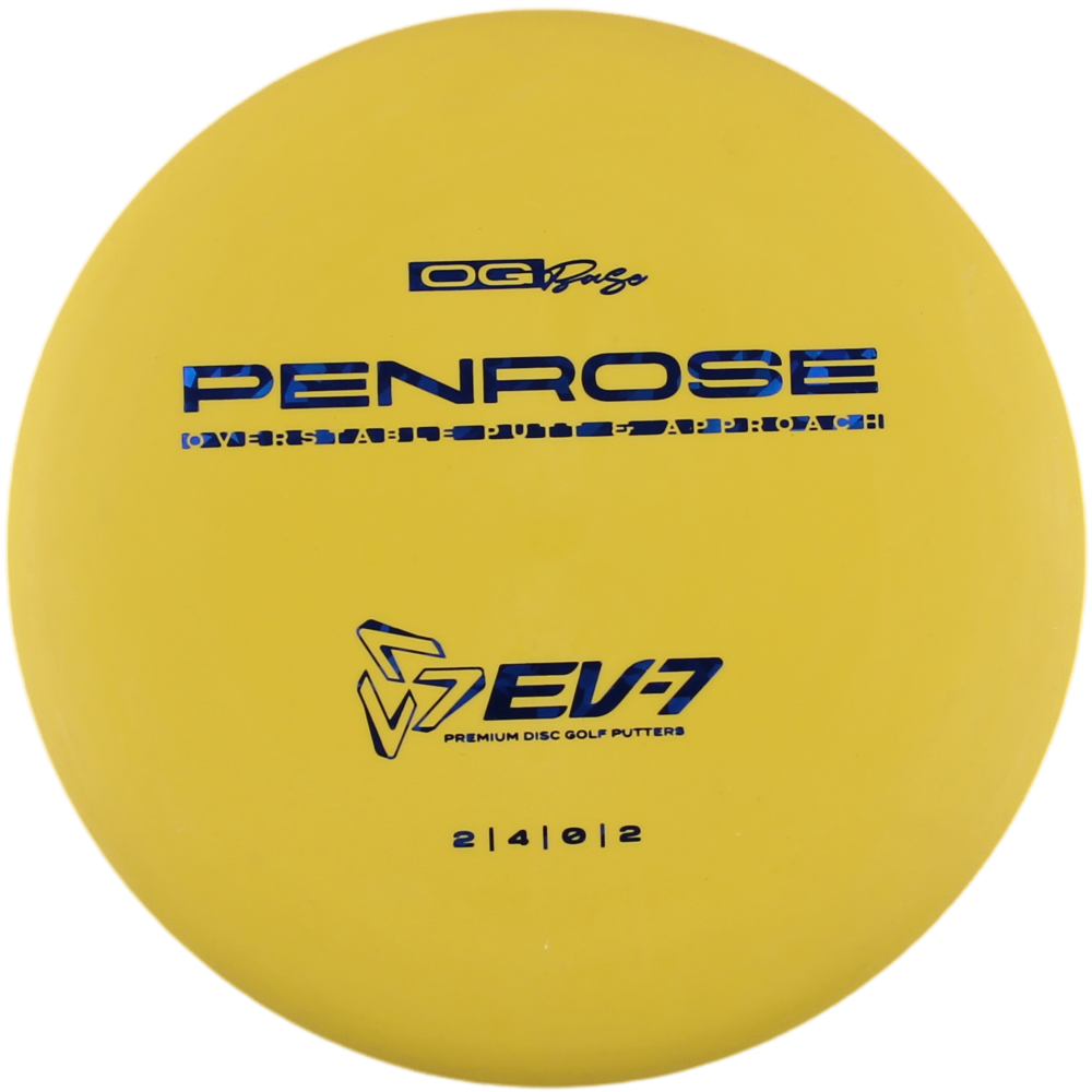 The Penrose is EV-7's debut putt and approach disc. It has reliable high-speed over stability and resistance to turn, but is uniquely straight with consistent fade at lower speeds on the putting green. With a slightly deeper profile, small bead, and smooth feel, the Penrose fits the hand comfortably, inspiring confidence for both putts and upshots.