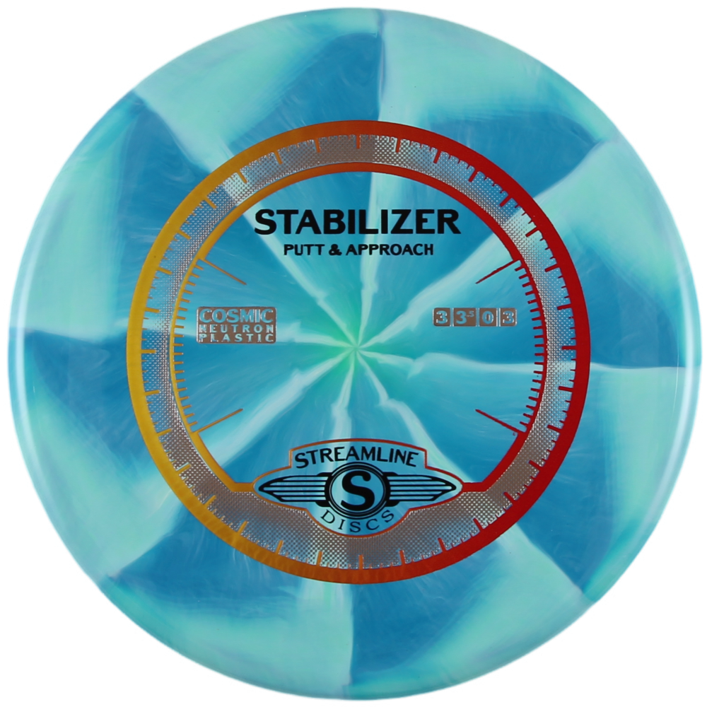 The Stabilizer is a new overstable putter from Streamline Discs, making its debut in Streamline Neutron and Cosmic Neutron plastic. This is the second putter from Streamline Discs and is overstable. The Stabilizer has a similar hand feel and depth, but with a slightly raised shoulder and more pointed nose that produces a flatter and more stable putter. The Stabilizer's defining flight characteristic is straight flights with minimal turn, into a strong finishing fade for point and shoot accuracy on the approach.